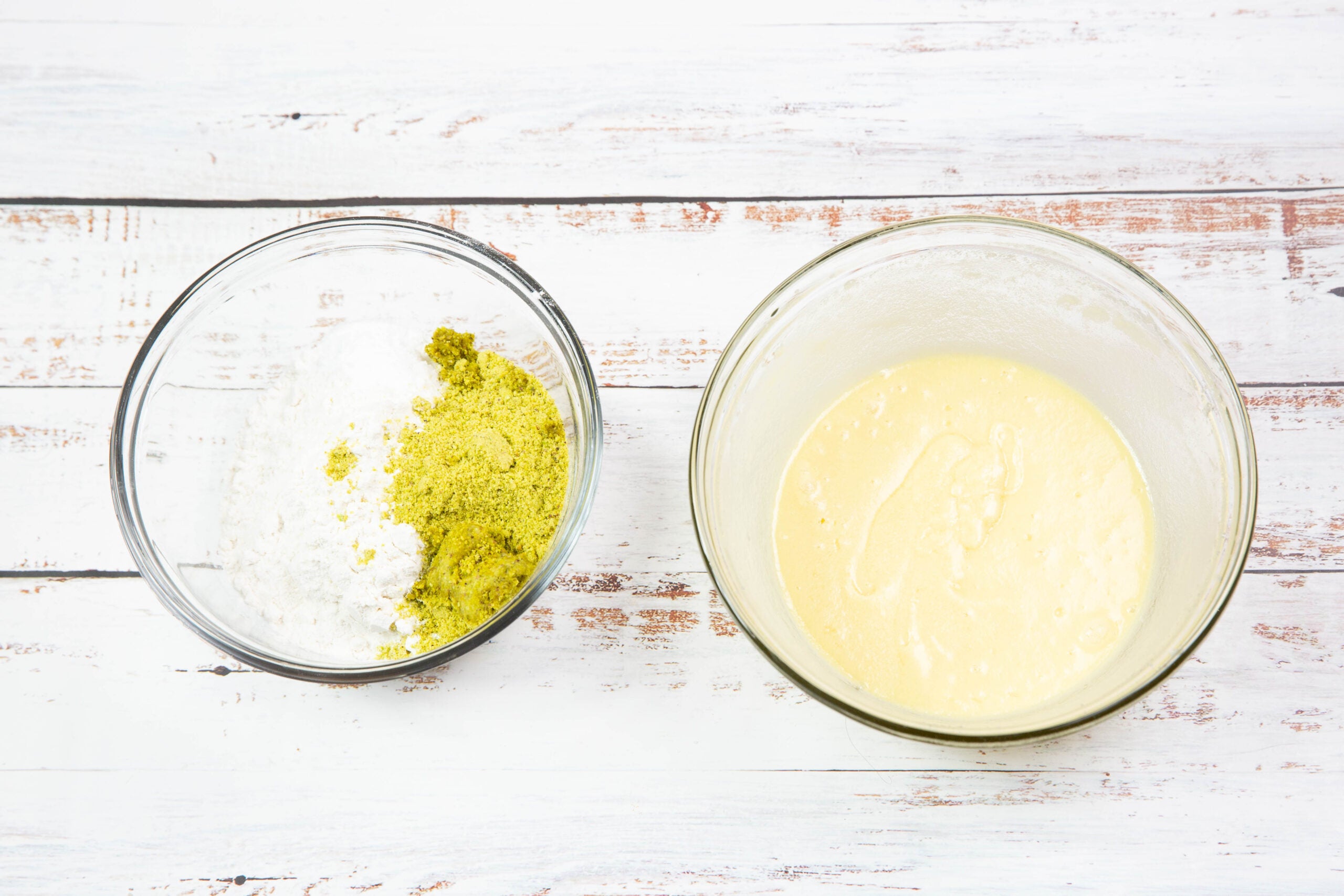 Add eggs and sugar and whip with a Stan mixer, whipper or a whisk for about 8 minutes. When done, the batter should look thick, tripled in volume, and it should ribbon off the attachment. Add vanilla, rosewater, and pistachio extract, mix until just combined.