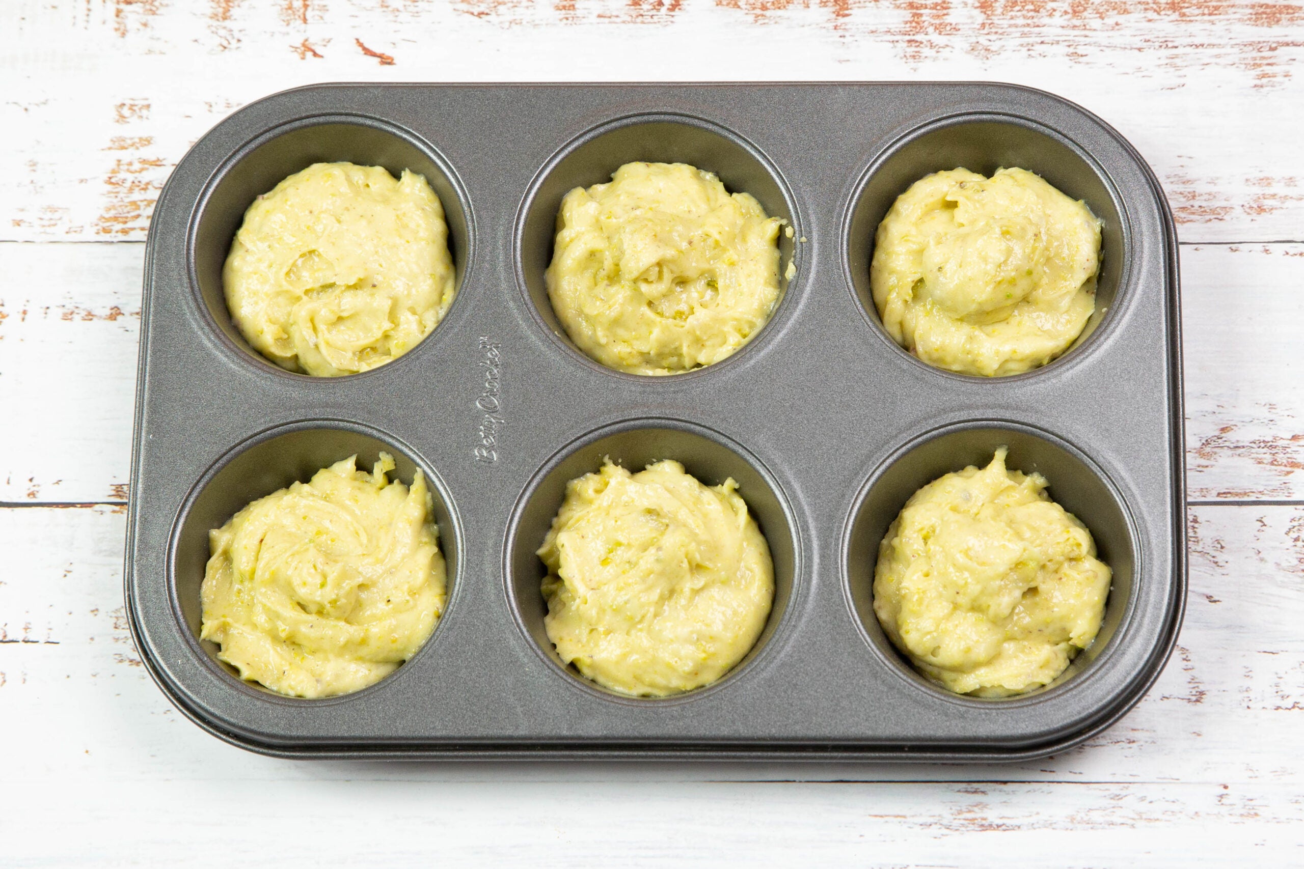 Add the dry ingredients to the wet ingredients bowl. Lightly whisk the dry ingredients into the batter, only mixing until just combined. Delicately fold the the melted butter into the batter until it is well combined, but the batter isn’t deflated. Pour into your muffin mould until half full.