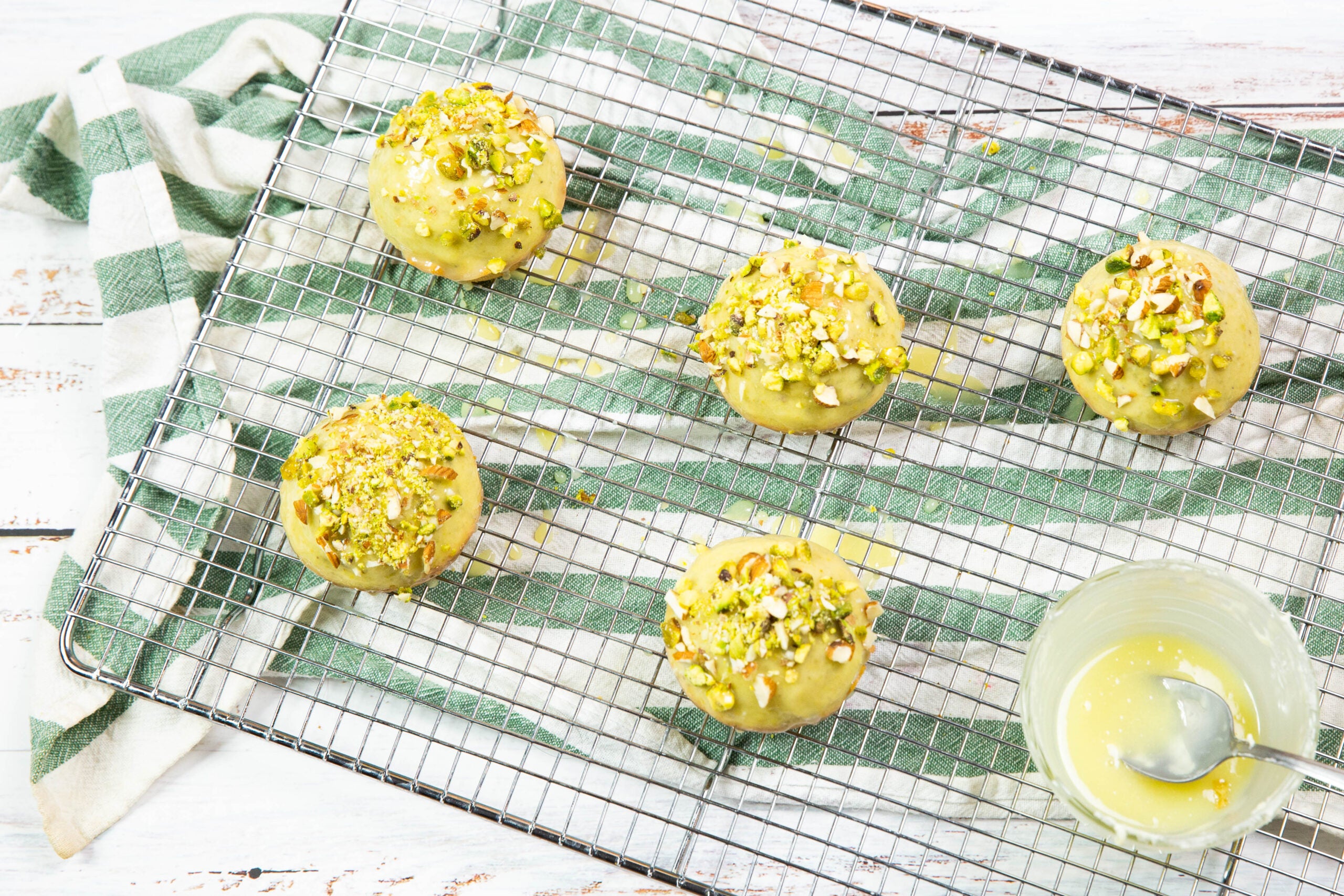 Place into the freezer for 15 minutes.Remove the pans from the freezer and place into the oven to bake for 12 minutes. Remove from oven and place onto a wire rack to cool. When cooled, dip each Muffin into the melted white chocolate and decorate with crushed pistachios.