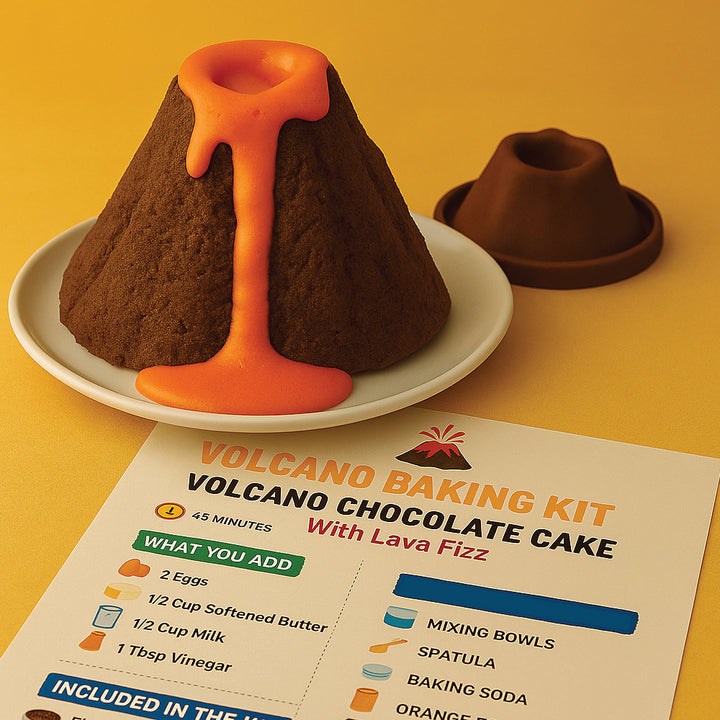 Picture this: your child, aproned like a "scientist," pouring, mixing, and giggling as the sweet, gooey homemade volcano comes to life. The cake begins as simple batter — simple to make, simple to eat — and culminates in a grand chocolate mountain, dripping with molten lava crafted from fizzy, rainbow-tasting bliss. It's not just a dessert… it's an Activity Kit that discovers the chemistry of magic through baking!