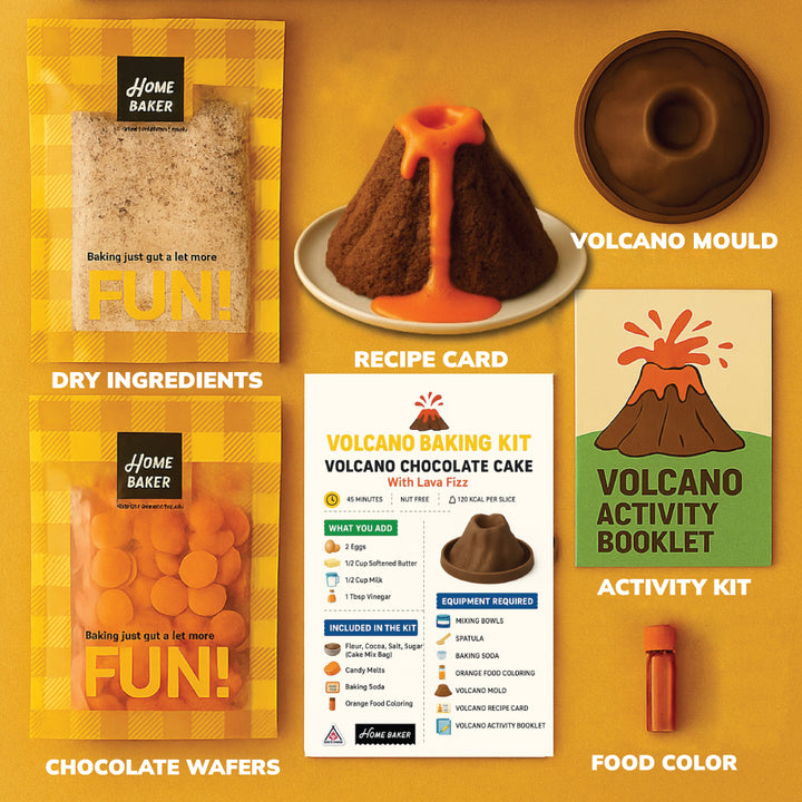 Our HomeBaker Volcano Chocolate Cake with Lava Fizz Kit comes with pre-measured organic ingredients, clear step-by-step instructions, and a sprinkle of wonder. No stress, no mess — just the joy of discovery (and dessert!). You’ll learn how ingredients interact like little scientists, and then reward yourselves with a decadent bite of your creation.
