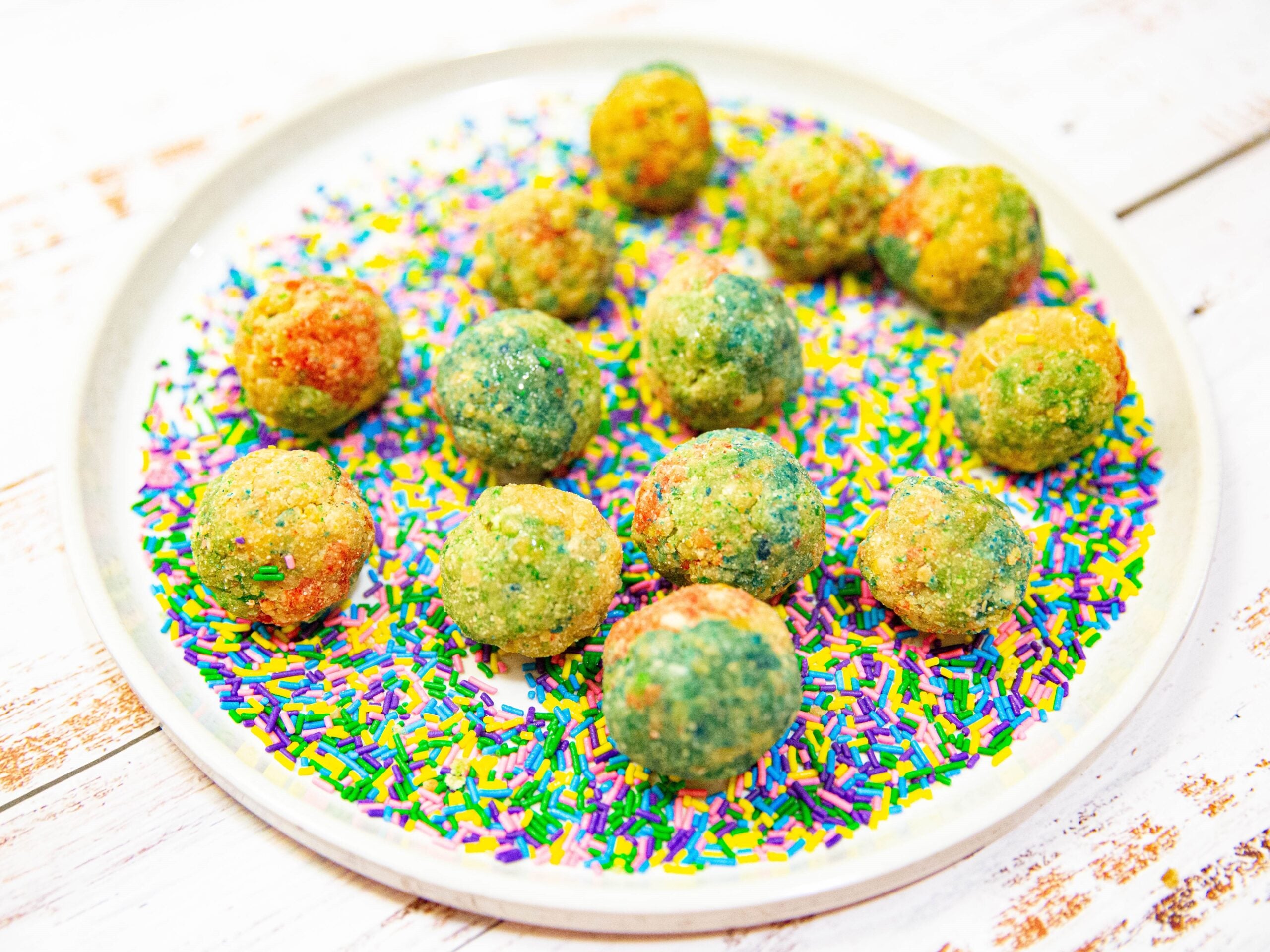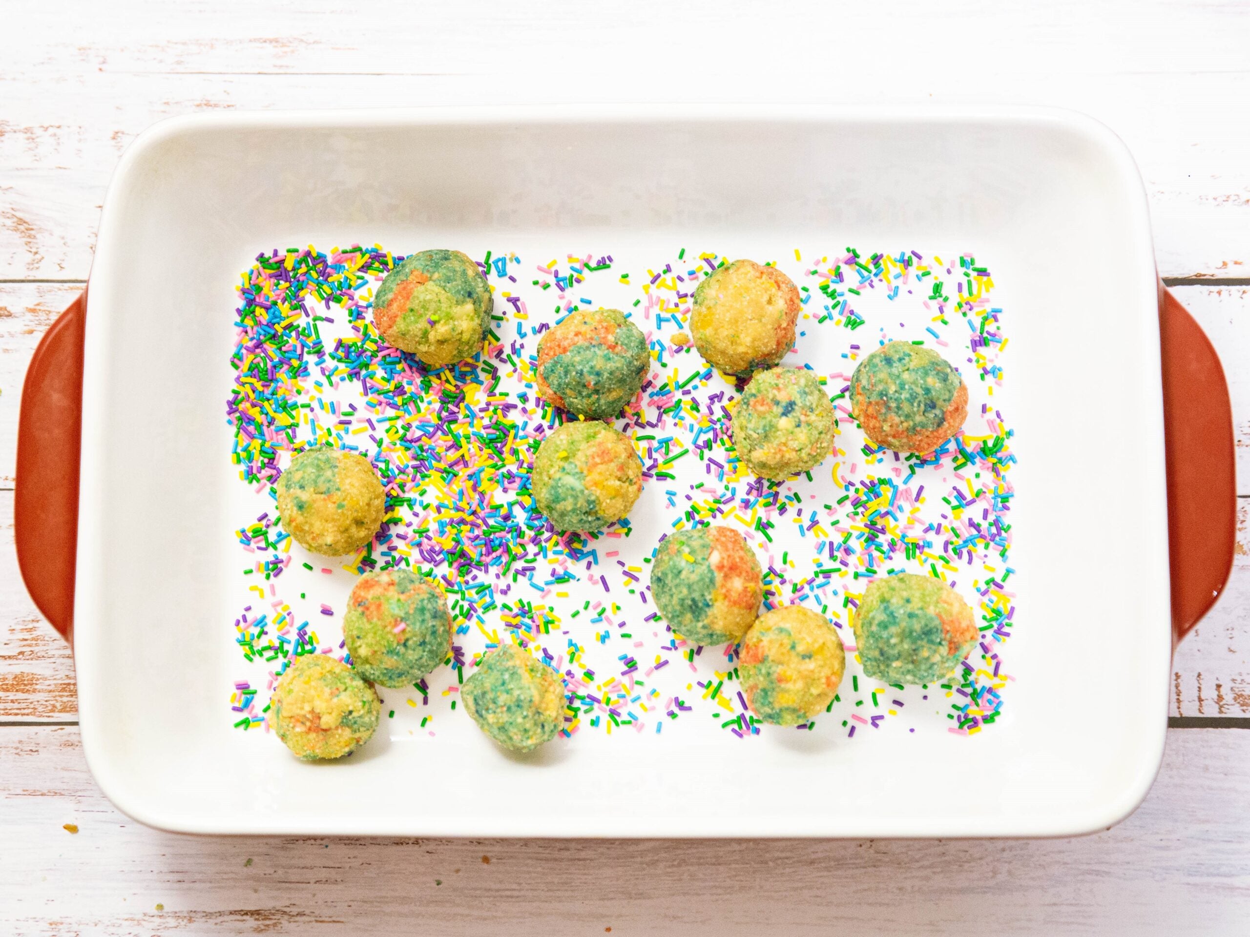 Coat a tray/plate/clean surface with multi-colored sprinkles. Take a little bit of each color. Mush them together and roll into a bite-sized ball.