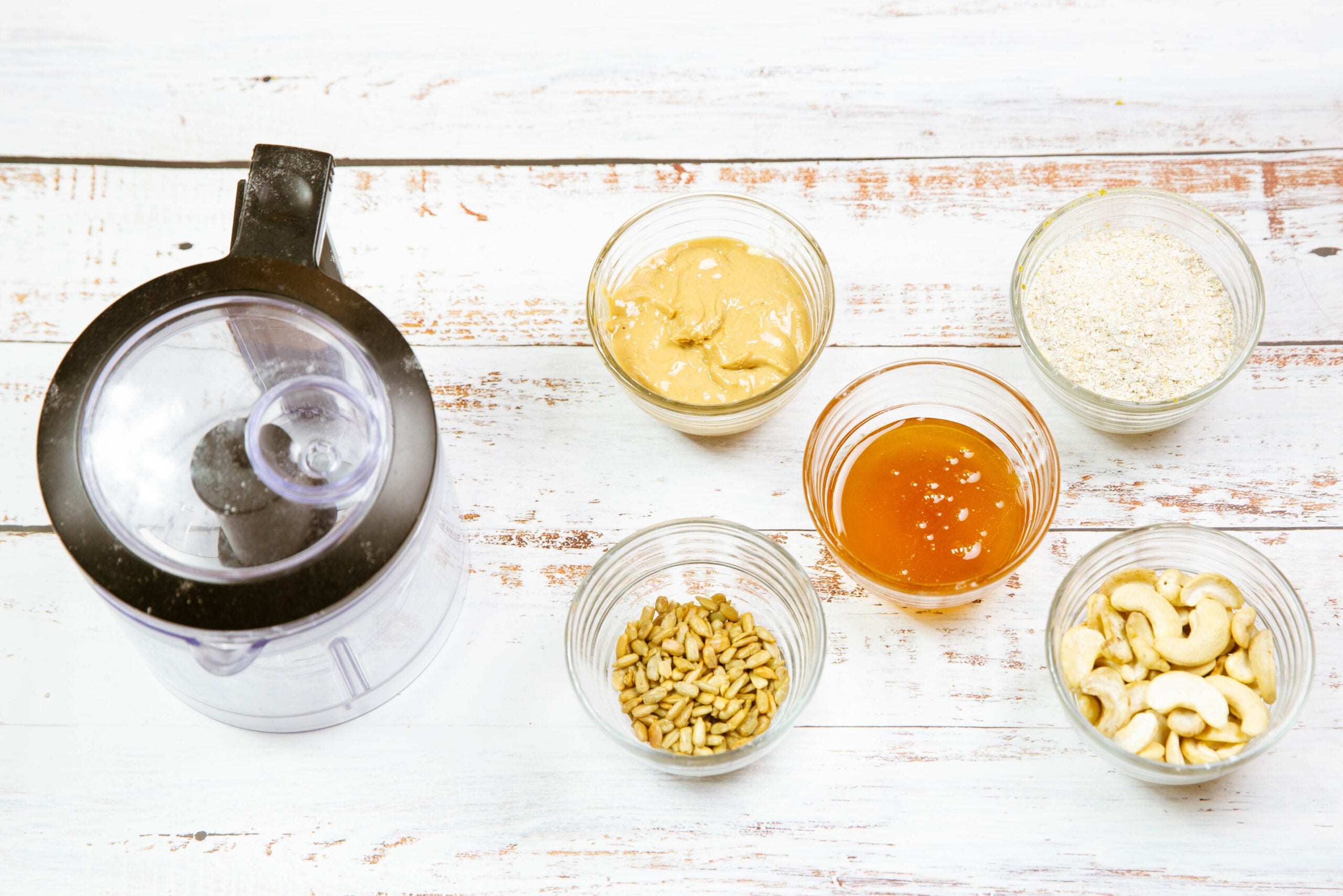 Put your cashew butter, peanut butter, oats, sunflower seeds and raisins in a big bowl. Mix with your little fingers or a spatula until everything is combined.